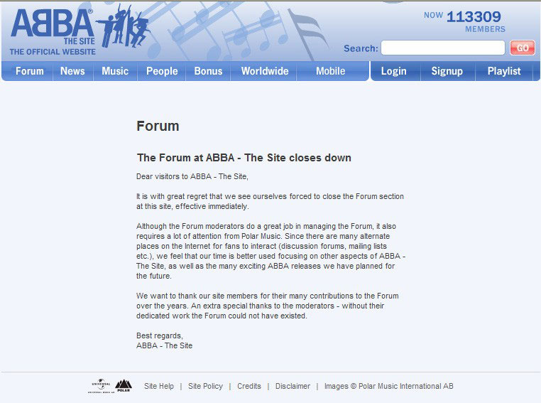 The Forum at ABBA - The Site closes down - where is a fan to go?On October 10th, ABBA fans visiting the official ABBA site were stunned to find the following message:“Dear visitors to ABBA - The Site, “It is with great regret that we see ourselves forced to close the Forum section at this site, effective immediately.“Although the Forum moderators do a great job in managing the Forum, it also requires a lot of attention from Polar Music. Since there are many alternate places on the Internet for fans to interact (discussion forums, mailing lists etc.), we feel that our time is better used focusing on other aspects of ABBA - The Site, as well as the many exciting ABBA releases we have planned for the future. “We want to thank our site members for their many contributions to the Forum over the years. An extra special thanks to the moderators - without their dedicated work the Forum could not have existed.”Unofficial internet forums, chat rooms and mailing lists immediately exploded with shock, surprise and speculation about why the forum was closed so suddenly and without warning. Despite a number of popular theories, it seems that it’s as simple as the announcement said: there was no one particular reason for the forum’s sudden closure, and it certainly wasn’t any recent posts that had any input into the final decision, which was probably made long before the forum was actually closed. Fans need not despair, as there are many other ABBA forums where fans can get together, interact, and talk ABBA 24 hours a day, seven days a week.The Abbasite4ever forum was started almost immediately by a small group of regular contributors to ABBA – The Site’s forum. This has become very popular and has effectively become a mirror of the official site forum, with a similar tone, topics and many former ABBA site members. ABBAMAIL’s forum is a popular alternative forum for fans looking for something with a less reverent view of ABBA. Club ABBA is a new site with a forum that has been slow to start, but is attracting more fans. The ABBA Express forum focuses more towards collecting, though there is still general discussion about ABBA. Other popular and active forums include Let The Music Speak and ABBA Story. Among the foreign language forums are ABBAfórum in Hungarian, ABBA Italia in, of course, Italian, but it also has a section for English speakers, and, for Russian speakers, there is ABBA Net and ABBA – Legend of the Century!, both busy forums. A version of this article appeared in the December 2006 issue of the Official International ABBA Fan Club Magazine. |