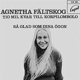 Så glad som dina ögon (2.59)(Agnetha Fältskog/Kenneth Gärdestad) Lead vocal: Agnetha. Recorded by Agnetha in 1972. First released by Agnetha as B side to Tio mil kvar till korpilombolo single in 1972. Excerpt used in the spoken word record En hälsning till våra parkarrangörer. Currently available on the CDs Tio år med Agnetha and My Love, My Life. |